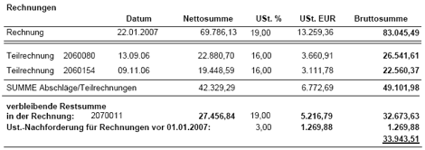 Haben Sie bereits in 2006 Teilrechnungen für ein Projekt gelegt, dass erst 2007 fertig gestellt wird, müssen Sie auf der Gesamtrechnung die zwei Steuersätze getrennt ausweisen, wenn die dafür geltenden Voraussetzungen gegeben sind.