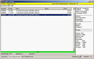 Durch Anklicken der jeweiligen Zeile erscheinen im rechten Infofenster weitere Informationen, unter anderem die Nettopreisanteile. Die Positionssuche kann auch bei der Positionskopie oder für die Projektsuche verwendet werden. In beiden Fällen springt 4Master zur Position, wenn diese ausgewählt wird.