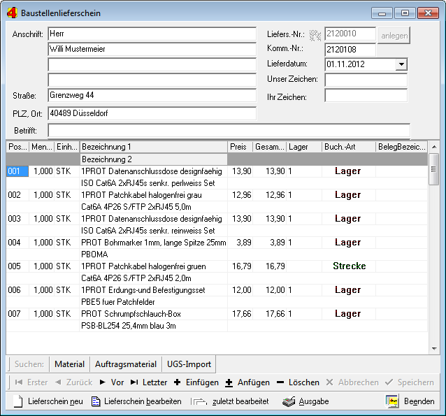 Ein Baustellenlieferschein kann Material aus der Dispoliste eines Projektes, aus der Materialverwaltung oder aus manueller Eingabe enthalten. Sinn dieses Programmmoduls ist die Abbildung des Vorgangs der Entnahme von Artikeln aus dem Lager, mit dem Zweck, diese auf der Baustelle einzubauen. Um diesen Vorgang zu dokumentieren, kann über dieses Modul ein Lieferschein erstellt und gedruckt werden.