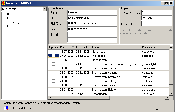 Wenn Sie jetzt die Datanorm Direkt-Schnittstelle starten, finden Sie dort alle Lieferanten vor, bei denen Sie zuvor die Datanorm Direkt-Kontaktdaten editiert haben.
