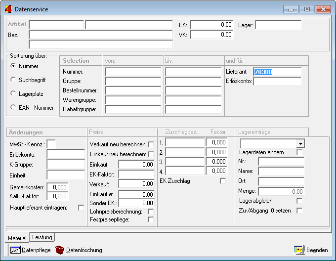 Die Material-Datenpflege bietet umfangreichere Möglichkeiten als die Leistungspflege. Sie können hier nach der Sortierung bzw. Eingrenzung des Bereiches bestimmen, was geändert werden soll.