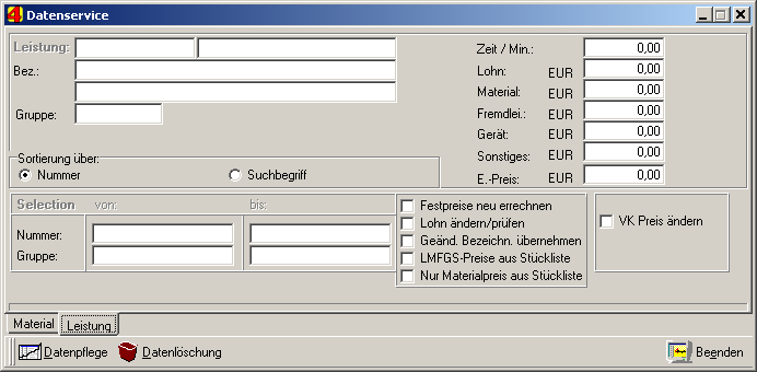 Der zweite Bereich innerhalb der Datenpflege ist die Leistungspflege, ersichtlich auf der vorherigen Abbildung. Diese bietet jedoch andere Möglichkeiten als die vorgenannten Funktionen bei dem Material. Dabei sind die Felder Bezeichnung, Gruppe, Zeit/Min., Lohn, Material, Fremdleistung, Gerät, Sonstiges und Einheitspreis nur Informationsfelder, die angezeigt werden, wenn die Datenpflege der Leistungen durchläuft. Nun folgt zuerst der Sortierbereich, das bedeutet, die Reihenfolge, in der die Leistungen gepflegt werden. Sie können Ihre Auswahl für Nummer oder Suchbegriff treffen. Danach folgt die Selektion. Hier geht es nun tatsächlich um den Bereich der Leistungen, die gepflegt werden sollen. Eine Eingrenzung können Sie über die Nummer (von/bis) oder die Gruppe (von/bis) vornehmen. Wenn Sie die Felder nur bestätigen, werden danach alle Leistungen geändert. Die ergänzende Abfrage "Festpreise neu errechnen" bezieht sich darauf, ob innerhalb der Leistungen Festpreise angelegt wurden, die Information "Lohn ändern/prüfen" darauf, wenn ein neuer Betriebsmittellohn im Programmbereich Daten-Betriebsparameter bestimmt wurde und die Angabe "Geänderte Bezeichnung übernehmen", ob sich im Material die Textbezeichnung (Kurztext 1 und 2) geändert hat (z.B. über einen Datanorm-Änderungssatz), damit in der Stückliste dann zukünftig auch die aktuelle Beschreibung wiederzufinden ist. "LMFGS-Preise aus Stückliste": Dann wird in den ausgewählten Leistungen alles auf Null gesetzt und die Stücklisten aktualisiert. Dadurch gehen manuell eingetragene Werte verloren; nur aktuelle Stücklistenpositionen bestimmen den Preis! "Nur Materialpreis aus Stückliste": Errechnet aus der Stückliste der Standardleistung den Materialpreis neu und trägt diesen in die Standardleistung ein. Eine Aktualisierung der Stückliste anhand der Stammdaten findet dabei nicht statt.