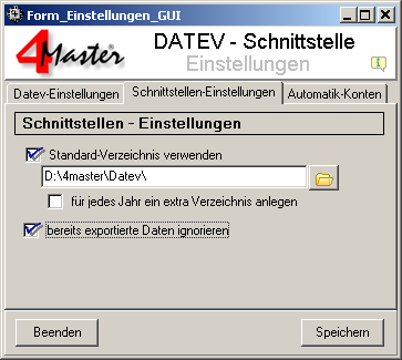 •Standardverzeichnis verwenden: Das Programm fragt bei Aktivierung dieser Option nicht bei jedem Export nach dem Verzeichnis. •Für jedes Jahr ein extra Verzeichnis anlegen: Legt für jedes Jahr ein Unterverzeichnis an, z.B. 2006, 2007 usw. •Bereits exportierte Daten ignorieren: Exportiert bereits exportierte Daten nicht erneut.