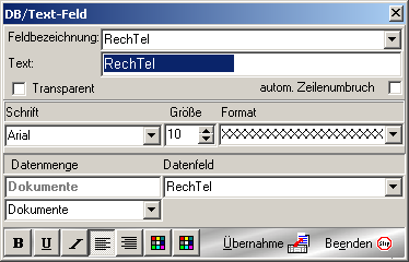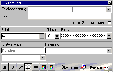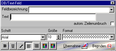 Sie können über die Button Datenfelder können mit Hilfe der Komponente "Datenbankfeld" ausgedruckt werden. Platzieren Sie diese Komponente in einen Reportabschnitt (Band) und wählen sie das Datenfeld, deren Daten ausgedruckt werden sollen. Wählen Sie dann über die Anwahl Format das gewünschte Ausgabeformat aus. Sie können auch die Komponente "Rechenfeld" benutzen, um Felder die nicht in der Datenbank stehen, zu berechnen und auszudrucken.