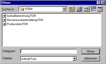 Nach dem Öffnen der Listbox (Dateityp) können Sie die bestehenden Formulare: Reporte (Listen, vorherige Abbildung), Projekte (Dokumenten)-Formulare (nachfolgende Abbildung) oder Aufmaßformulare (übernächste Abbildung) anwählen. Je nach Anwahl des Dateityps erscheinen unterschiedliche Bänder-Button, die zur Platzierung auf dem Formular angeboten werden.
