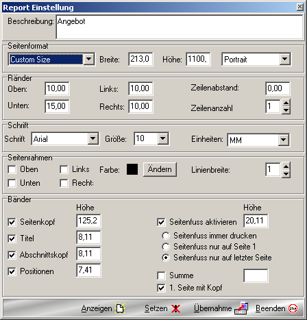 Die jeweilige Option kann im Formulardesigner in den Reporteinstellungen ausgewählt werden. Um die beiden letzteren Funktionen nutzen zu können, muss das Band "Übertragsfuß" im entsprechenden Formular vorhanden sein. Wenn nicht vorhanden, kann es aus "Vorlagen.FDC" kopiert werden. Der Übertragsfuß druckt stellvertretend für den "normalen" Seitenfuß die Überträge.