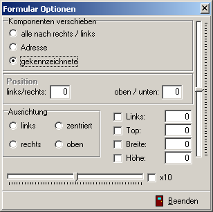 •Markieren Sie zu bearbeitende Felder mit Strg + linker Maustaste und betätigen Sie in der Fußzeile den Schalter "Ausrichten". •"Gekennzeichnete" auswählen. •Die Felder können nun mittels Regler verschoben werden. "x10" bewirkt eine Beschleunigung der Verschiebung um den Faktor 10. •Im Feld "Ausrichtung" können die markierten Felder an einem Feld innerhalb der Markierung ausgerichtet werden, zum Beispiel können alle Felder links ausgerichtet werden. Dabei orientiert sich das Programm an dem am weitesten links stehenden Element der Markierung. •Im Ausrichten-Dialog kann die obere und linke Position zuvor mit Strg + linker Maustaste ausgewählter Elemente direkt durch Eingabe der Koordinaten festgelegt werden. Außerdem können Breite und Höhe von Elementen numerisch definiert werden. Um einen Wert zu ändern, muss das Feld vor der zu ändernden Eigenschaft angekreuzt werden. Tipp: Um die Position eines Formularfeldes zu ermitteln, klicken Sie es an. Dann werden unten links die Koordinaten der linken oberen Ecke des Elementes angezeigt.