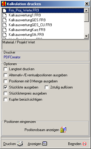 Wählen Sie hier die zu druckende Auswertung (Formular auswählen). Unten werden für bestimmte Auswertungen noch Auswahlmöglichkeiten angezeigt, was mitgedruckt werden soll, z.B. ob mit Stückliste gedruckt werden soll.
