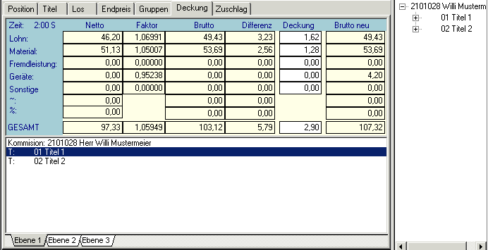 Man kann Deckungsbeiträge fürs Gesamtprojekt, für einzelne Lose oder Titel definieren. Dann wird die entsprechende Zeit z.B. des unten in der Liste gewählten Titels für die Kalkulation herangezogen. Haben Sie unten die "Kommission", ein Los oder einen Titel ausgewählt, können Sie in der Spalte "Deckung" für die einzelnen Kalkulationsarten Deckungsbeiträge / h hinterlegen. Dabei werden dann in den betroffenen Positionen die Kalkulationsfaktoren geändert. Beispiel: Titel 1 enthält 2 Stunden. Material-Netto beträgt hier 51,13 EUR; Material-Brutto beträgt 53,69 EUR (Gewinn 2,56 EUR für Material). Das ist ein Gewinn von 5% (Kalk.-faktor = 1,05). Damit ergibt sich eine Deckung für Material im Titel 1 von: Gewinn (2,56 €) / Zeit (2 Std) = 1,28 EUR. Nun wird die Deckung für Material auf 3 EUR erhöht (Gewinn pro Stunde für Material). Daraus folgt: 3 EUR x 2 Std. = 6 EUR. 51,13 EUR + 6 EUR = 57,13 EUR (neuer Bruttowert). 57,13 EUR / 51,13 EUR = 1,11735 (neuer Kalk.-faktor) => 11,7% Gewinn in Titel 1 für Material.