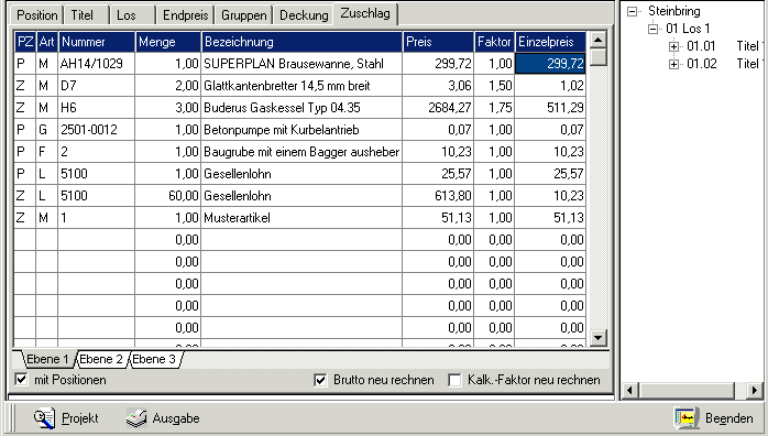 Positionskalkulation Hier gibt es die Möglichkeit, Kalkulationsfaktoren für die einzelnen Kalkulationsarten (Lohn, Material, Fremdleistung, Geräte, sonstiges) zu hinterlegen (Spalte "Faktor"). Die zu kalkulierende Position klickt man dazu zunächst rechts im Positionsexplorer an. Außerdem können zu Positionen aus dem Leistungsstamm oder manuell angelegten Positionen Stücklisten bearbeitet werden (Anlage, Löschung, Änderung von Stücklistenfaktor, -menge und -preis). Dies funktioniert analog der F4-Stücklistenkalkulation im "Erfassen". Um Stücklisten zu bearbeiten, klicken Sie unten in die dafür bereitgestellten Zeilen. Dann werden die entsprechenden Funktionen aktiviert.