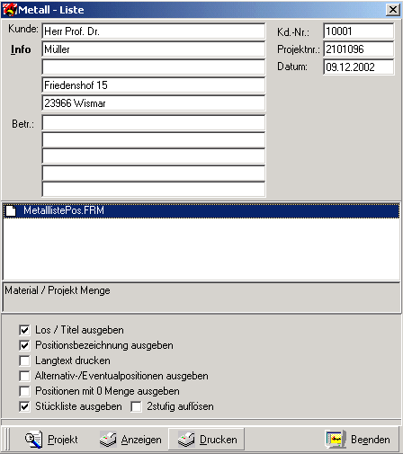 Über diesen Menüpunkt kann eine projektweise Metall-Liste gedruckt werden. Voraussetzung ist, dass das Projekt Materialpositionen enthält, bei denen in der Materialverwaltung Werkstoff hinterlegt wurde. Es können hier auch Artikel gedruckt werden, die in einer Stückliste stehen.