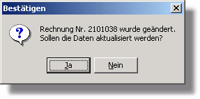 Wurde eine Rechnung im Journal geändert (durch erneuten Rechnungsdruck im Erfassen), wird beim Import ins Rechnungsbuch abgefragt, ob diese Rechnung im Rechnungsbuch aktualisiert werden soll. Die Rechnung wird nicht doppelt ins Rechnungsbuch übernommen. Die im Rechnungsbuch geänderte Rechnung wird erneut in die OP-Verwaltung übernommen. Der alte OP muss dort ggf. gelöscht werden, da in den OP nicht überschrieben wird.