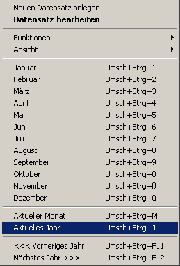 •Eingänge: Es werden nur Eingangsrechnungen angezeigt. •Ausgänge: Es werden nur Ausgangsrechnungen angezeigt. •Zeitraum: Es werden nur die Rechnungen des definierten Datumsbereichs angezeigt. Klicken Sie mit der rechten Maustaste auf die Tabelle, um per Kontext-Menü den anzuzeigenden Monat oder das anzuzeigende Jahr auszuwählen: