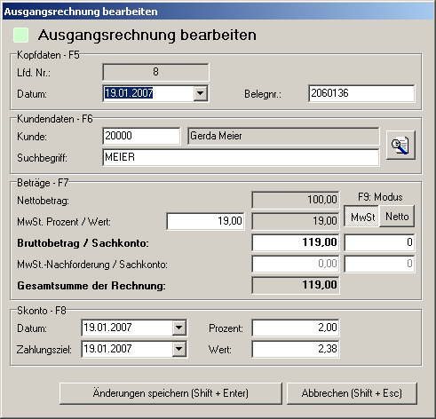Verwenden Sie zum Erzeugen eines neuen Datensatzes die Einfüge-Taste oder klicken Sie auf die entsprechende Funktion in der Fußleiste. Geben Sie die Werte im Bearbeitungsdialog ein. Pflicht sind Datum, Belegnummer, Kundennummer.