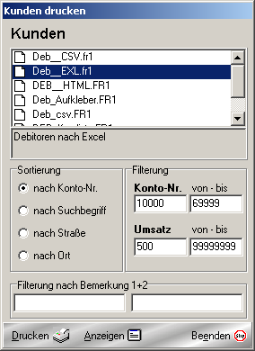 •Klicken Sie auf „Ausgabe" und wählen Sie im folgenden Fenster das Formular „Deb__EXL.fr1" aus (bei Export von Kundendaten).