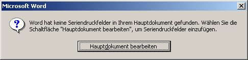 •Den anschließend eventuell angezeigten Hinweis, dass noch keine Seriendruckfelder angelegt wurden, bestätigen Sie mit „Hauptdokument bearbeiten".