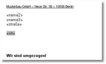 •Wiederholen Sie diesen Schritt so oft, bis Sie alle Adress-Felder eingefügt haben. Das Dokument sollte anschließend in etwa so aussehen: