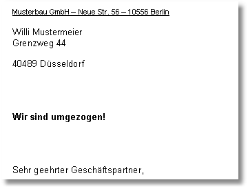 •Das erstellte Dokument kann, je nach Anzahl der Adressen, aus sehr vielen Seiten bestehen, da alle Anschreiben „am Stück" in ein einziges Word-Dokument geschrieben wurden. Eine einzelne Seite dieses Dokuments sieht z.B. so aus: