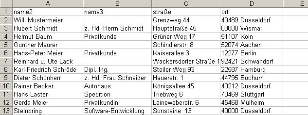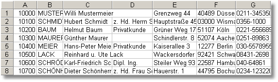 •Öffnen Sie das Excel-Dokument, um die Adressen zu bearbeiten. Die angezeigte Liste sollte in etwa so aussehen: