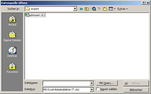 •Wählen Sie im Dateiauswahldialog die Datei adressen.xls aus und klicken Sie anschließend auf „Öffnen". Der folgende Dialog wird mit „OK" quittiert.