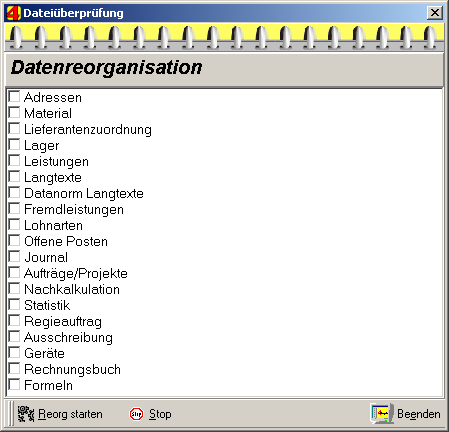 Der eigentliche Zweck der Datenreorganisation ist die endgültige Entfernung der vom Anwender im Laufe der Zeit gelöschten Datensätzen. In diesem Zusammenhang wird jeder Datensatz neu geschrieben. Dadurch können außerdem einige Datenprobleme behoben oder zumindest festgestellt werden.
