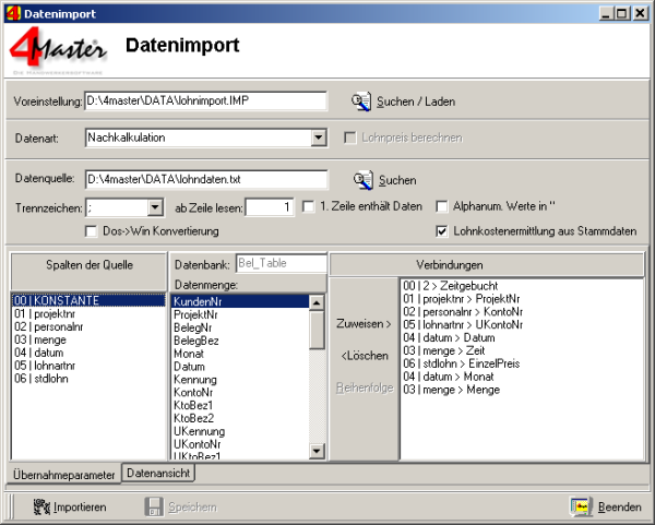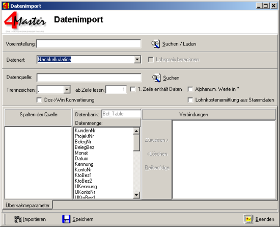 Beachten Sie, dass es durch unsachgemäßen Import zu Datenfehlern kommen kann. Sie sollten deshalb vor dem Import eine Kopie Ihrer Daten erstellen.Der Programmbereich Datenimport bietet Ihnen eine offene Schnittstelle zum Import von Datensätzen in 4Master. Fragen Sie Ihren Händler oder den 4Master Support wenn Sie Daten überspielen wollen ob evtl. schon eine Voreinstellung der zu übernehmenden Daten vorhanden ist. Wir bemühen uns, alle bekannten Übernahmemöglichkeiten mit der Programminstallation auszuliefern.