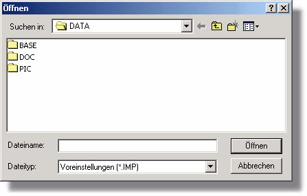 Die Funktion Suchen/Laden im oberen Bereich wählen Sie dann an, wenn Sie eine bestehenden Voreinstellung für die Übernahme verwenden, dargestellt auf der vorherigen Abbildung. Das nachfolgenden Fenster zeigt einige IMP-Voreinstellungen.
