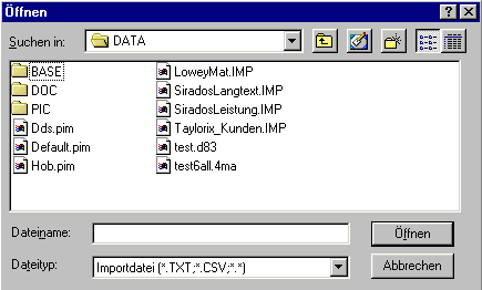 Datenquelle Wählen Sie die Datei die übernommen werden soll. Diese Datei muß ein bestimmtes Format haben um importiert werden zu können. Die Daten - Felder müssen mit Semikolon, TAB oder Komma getrennt sein. Semikolon getrennte Dateien werden meist im "CSV" - Format abgespeichert, dies kann z.B. auch aus "EXCEL" ausgegeben werden. Wenn Sie eine Datenquelle gewählt haben, können Sie auf "Datenansicht" umschalten, um hierdurch die Struktur der Daten zu überprüfen und die nachfolgenden Einstellungen einfacher zu beurteilen. Unter Datenansicht werden die ersten 50 Datensätze der gewählten Datei angezeigt! Reicht dies nicht können Sie über "Daten kompl. lesen" alle Datensätze der Datei anzeigen lassen! (vorausgesetzt der Arbeitsspeicher reicht aus um die Datei zu laden)