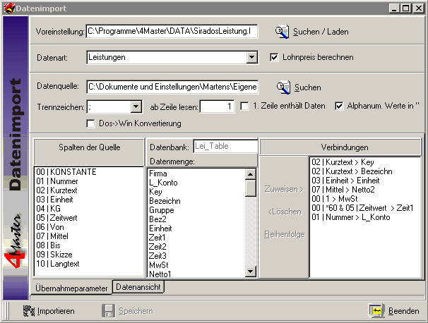 Voreinstellung Hier besteht die Möglichkeit einmal erstellte Datenverbindungen zu laden und diese wieder zu übernehmen. Wenn noch keine Importdateien (name.IMP) erstellt wurden, können Sie wie folgend Datenzuordnungen erstellen.