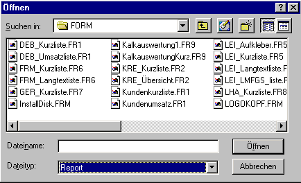 Über "Neu anlegen" wird nach Anwahl der Datenbank ein voreingestelltes Formular im Roh-Modus erzeugt. Der erste Schritt bei der Definition eines Reports besteht in der Erzeugung eines Formulars, das die Komponenten aufnimmt. Diese Formular wird als 'Reportformular' bezeichnet, da es nur als Behälter für Ihre Reports dient. Diesem Formular wird auf Grund der angewählten Datenbank eine Extension (z.B. NAME.FR4) zugewiesen dadurch in der Auswahlliste der Anwendung identifiziert. Nach Anwahl von "Bearbeiten" können Sie entscheiden welche Art von Formularen bearbeitet werden soll. Bänder z.B. Formularkopf oder Detailband dienen in der Formularerstellung zur Platzierung und Aufnahme von Beschriftungen, Datenbankfelder, Rechenfelder, Figuren, Bilder oder Systemwerte wie Datum, Zeit oder Seitenzahl. Die Größe der Bänder kann durch anklicken und runter- oder hochschieben der Ränder frei gestaltet werden. Zur Erstellung kann ein Band "groß" gezogen werden, die Beschriftung platziert und die Bandgröße später auf die tatsächliche Größe formatiert werden.