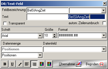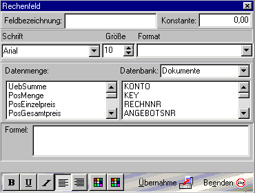 Sie können über die Button Datenfelder können mit Hilfe der Komponente "Datenbankfeld" ausgedruckt werden. Platzieren Sie diese Komponente in einen Reportabschnitt (Band) und wählen sie das Datenfeld, deren Daten ausgedruckt werden sollen. Wählen Sie dann über die Anwahl Format das gewünschte Ausgabeformat aus. Sie können auch die Komponente "Rechenfeld" benutzen, um Felder die nicht in der Datenbank stehen, zu berechnen und auszudrucken.