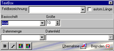 Nach Anwahl eines der o.g. Button haben Sie folgende Möglichkeiten, druckbare Komponenten in den Report einzufügen. Damit diese Informationen in Ihrem Report gedruckt werden, müssen Sie diese Komponenten in ein Band des Reports aufnehmen. Der Reportgenerator bietet dazu folgende Funktionen: Beschriftung Druckt statischen Text Datenbankfeld Druckt Datenbankfelder für bestimmte und anwählbare Datenbanken Rechenfelder Wertet Formeln aus und druckt die Ergebnisse. In dem Kapitel über Rechenfelder finden Sie weitere Informationen zu dieser Eigenschaft. Fließtext Gleicht der Komponente Beschriftung, ist allerdings in der Lage, mehrzeiligen Text auszudrucken. In der Regel für den Druck z.B. von Langtexten verwendet. Figur Druckt Rechtecke, Kreise sowie horizontale und vertikale Linien. Bild Druck Bilder Datum / Zeit Wird zum Druck weiterer Informationen, wie Seitenzahl oder Datum verwendet. Alle Textkomponenten haben einige grundlegende Merkmale gemeinsam. AutoSize Komponenten können ihre Breite entweder selbst so ausrichten, dass der auf ihnen platzierteText ausgedruckt werden kann, oder mit einer vorher gesetzten Breite arbeiten. In diesem Fall wird eventuell der Text abgeschnitten, damit der vorgegebene Ausgabebereich nicht überschritten wird. Schrift und Schriftfarbe Druckbaren Textkomponenten sind entweder eigene Schrifteinstellungen zugewiesen oder sie verwenden die Einstellungen des übergeordneten Abschnitts bzw. Reports. Mit der Schriftanwahl überschreiben Sie die Einstellungen des übergeordneten Abschnitts. Ausrichtung Komponenten können rechts- oder linksbündig sowie zentriert ausgerichtet sein. Statischen Text drucken Statischer Text, zum Beispiel Überschriften oder Feldnamen, wird normalerweise über die Komponente Beschriftung gedruckt. Positionieren Sie einfach diese Komponente in einen Abschnitt und geben Sie in der Eigenschaft "Text" die Beschriftung an. Grafische Elemente drucken Mit grafischen Elementen lassen sich optische Effekte erzielen und die Gestaltung von Reports verbessern. Mit Hilfe der Komponente "Figur" lassen sich einfache grafische Elemente ausdrucken. Dazu platzieren Sie diese Komponente in einem Abschnitt und setzen die Eigenschaft und das gewünschte Erscheinungsbild ein. Über die Eigenschaft "Stift" wählen Sie den Zeichenstift. Grafiken drucken Der Report kann mit Hilfe der Komponenten "Bild" Grafiken drucken. Folgende Grafikformate können gedruckt werden: Bitmap- (BMP), Windows-Metafile- (WMF) und Icon-Dateien (ICO).