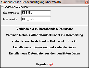 Alternativ zum gewöhnlichen Druck der Kundendienstformulare ist es möglich, die Daten des markierten Planungseintrags und des zugehörigen Wartungsprojekts als Seriendruckfelder an ein MS-Word-Seriendruckdokument zu übergeben. Dies umfasst die Projektdaten, Daten aus Mess- und Gerätemasken und die Planungsdaten. Hierdurch wird eine freie Gestaltung Ihrer Geschäftspapiere in MS Word ermöglicht. Jedoch kann pro Ausgabe immer nur ein einzelnes Kundendienstformular ausgegeben werden, während beim gewöhnlichen Druck Kundendienstformulare aller markierten Datensätzen ausgegeben werden können. Die Export-Funktion steht in Wartungs- und Störungsplanung zur Verfügung, allerdings nur in der Plus-Version.