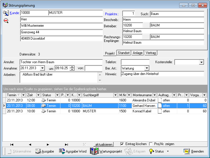 Hintergrund: Ein Kunde ruft an, um eine Störung an einer Anlage zu melden. Diese Störung wird von einem Mitarbeiter aufgenommen. Dabei hat dieser Zugriff auf die Adressverwaltung und die Wartungsprojekte und kann so den Vorgang zuordnen.