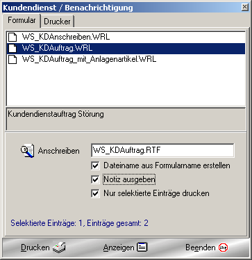 Der Schalter "Ausgabe" ermöglicht den Druck von Kundendienstaufträgen: