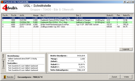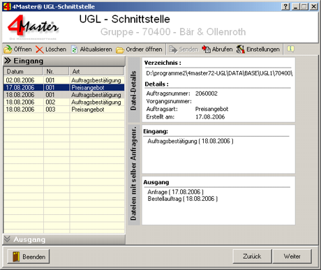 Im Einzelnen stellt sich das in 4Master wie folgt dar: Beim Anlegen einer Bestellung wird der UGLSchalter gesetzt. Nach Speichern startet das Programm dann automatisch die UGL-Schnittstelle. Es können ein Kundenauftragstext, Zusatztexte und ein gewünschtes Lieferdatum eintragen werden. Durch Klicken auf [Weiter] erscheinen die tabellarisch aufgelisteten Artikel. Zu jedem Artikel können dort weitere Informationen eingegeben werden. Durch nochmaliges Klicken auf [Weiter] gelangen Sie zu der Preisanfrage, die automatisch auf den FTP-Server hochgeladen werden kann. Dort wird sie vom Großhändler bearbeitet und ein Preisangebot auf den FTP-Server abgelegt. Dazu muss in regelmäßigen Abständen nachgeschaut werden, ob das Preisangebot schon vorliegt. Durch Anklicken des Schalters „Abrufen“ in der UGL-Schnittstelle, wird dann die Preisanfrage in den Eingang abgelegt. Dort die Zeile auswählen und 2x auf [Weiter] klicken. Das Preisangebot erscheint. Hier können die Preise und Artikel noch mal geprüft werden. Beim Einverständnis kann mittels [Weiter] gleich zur Bestellung gegangen und diese hochgeladen werden.
